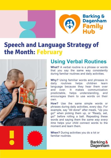 Every month, Barking and Dagenham Family Hub promote a strategy to develop speech and language. This month, the strategy is about using consistent verbal routines to help your child understand the meaning of new words and grow their vocabulary. If you have any concerns about your child’s speech and language development please do speak to us at school.