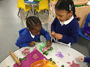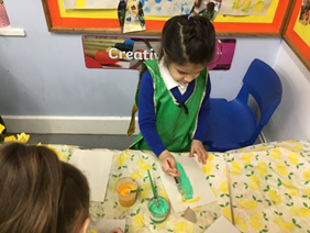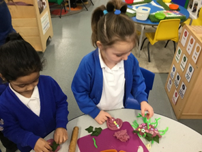 We looks very closely at the blossom from the tree and we drew and printed some wonderful blossom trees of our own. We also enjoyed playing with Spring playdough.