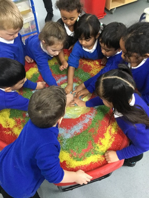 This week we have been learning about Diwali. We have had a lot of fun making Rangoli patterns in different ways. We have practised our fine motor skills by carefully using beads to make Rangoli patterns ensuring that we are using the correct grip when holding mark making tools. We have also practised our scissor skills by carefully cutting out a flame for our beautiful lamps.