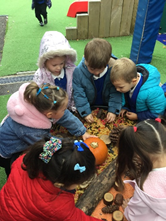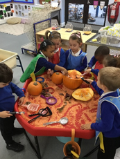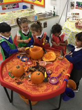We have drawn Autumn trees and used the correct colours. We also really enjoyed exploring pumpkins, using tweezers to pick up the seeds and scoops to scoop out the pulp inside!