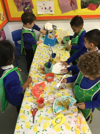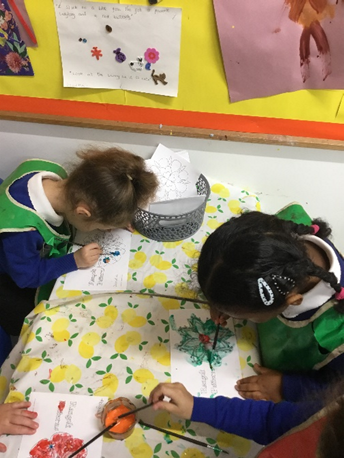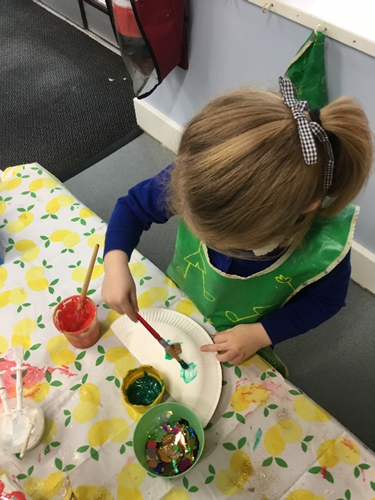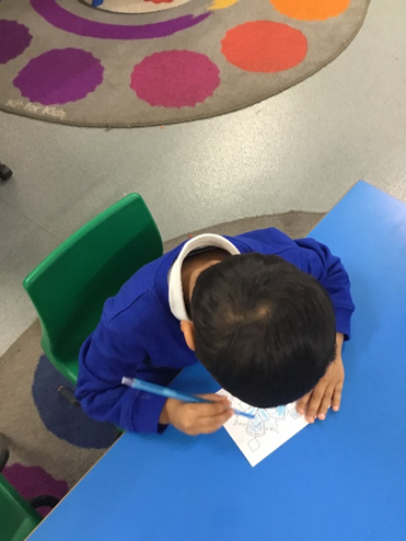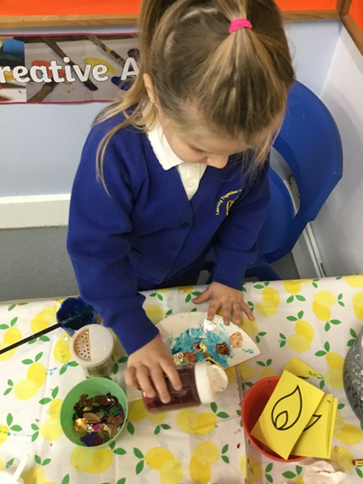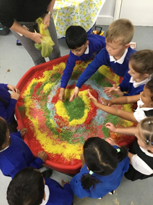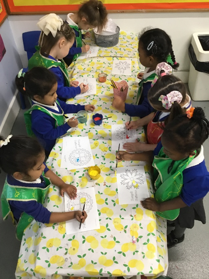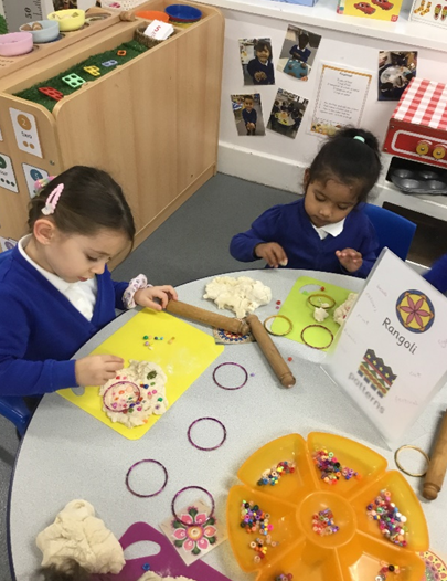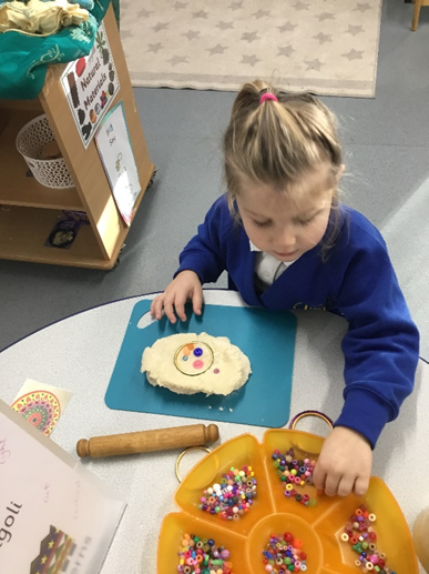 This week we have been learning about Diwali. We have had a lot of fun making Rangoli patterns in different ways. We have practised our fine motor skills by carefully using beads to make Rangoli patterns ensuring that we are using the correct grip when holding mark making tools. We have also practised our scissor skills by carefully cutting out a flame for our beautiful lamps.