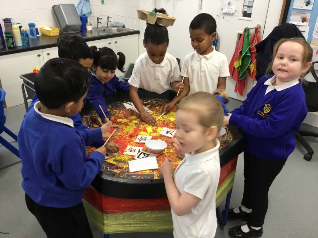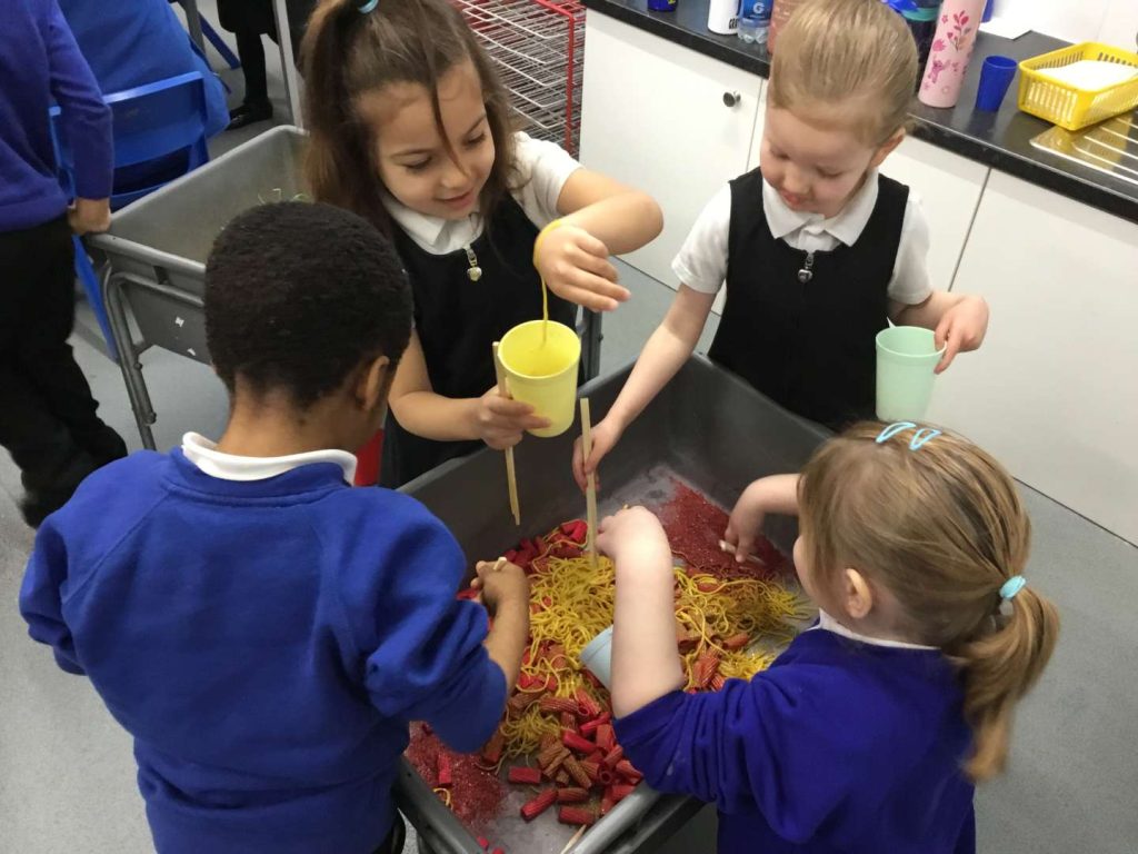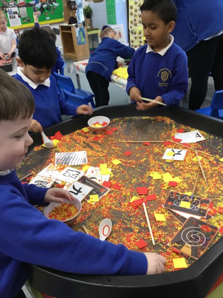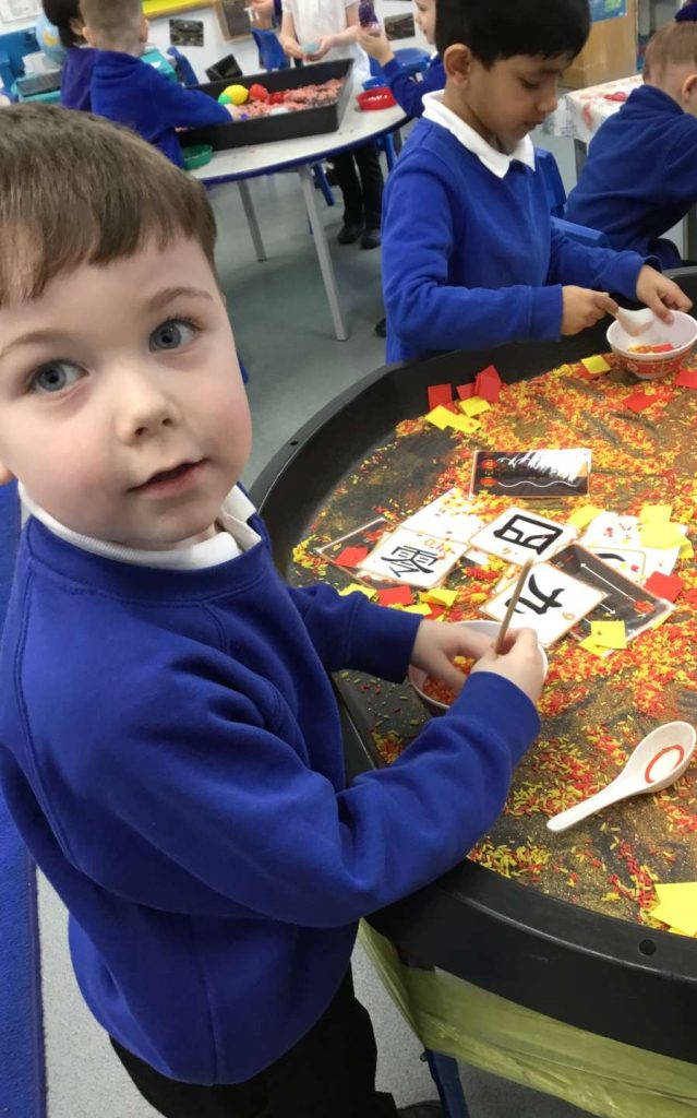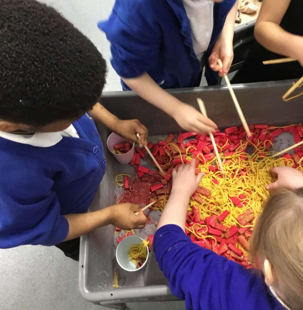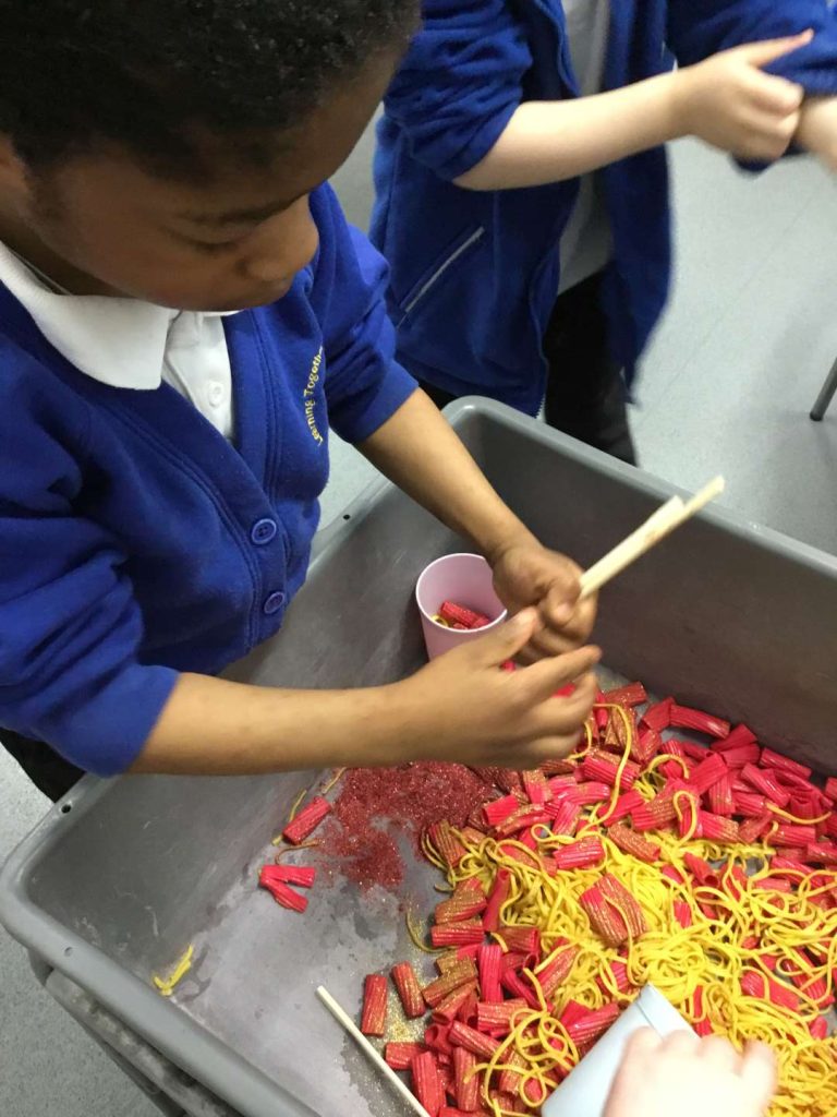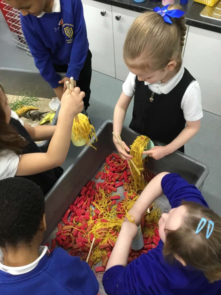 The children enjoyed some wonderful sensory activities too. They experimented with mark-making in rice and glitter, and even had a go at drawing Chinese symbols and numbers. Using paint and thin brushes, we carefully wrote our names using Chinese symbols, showing fantastic concentration and control. We also practised our fine motor skills by using chopsticks to pick up noodles and pasta, which was lots of fun!