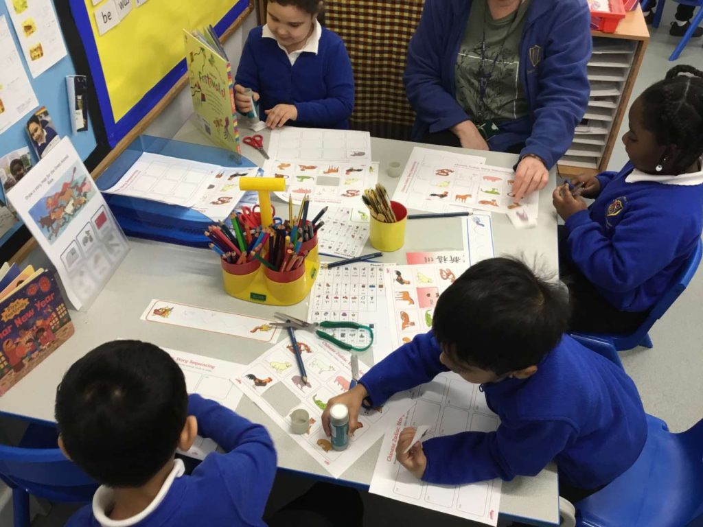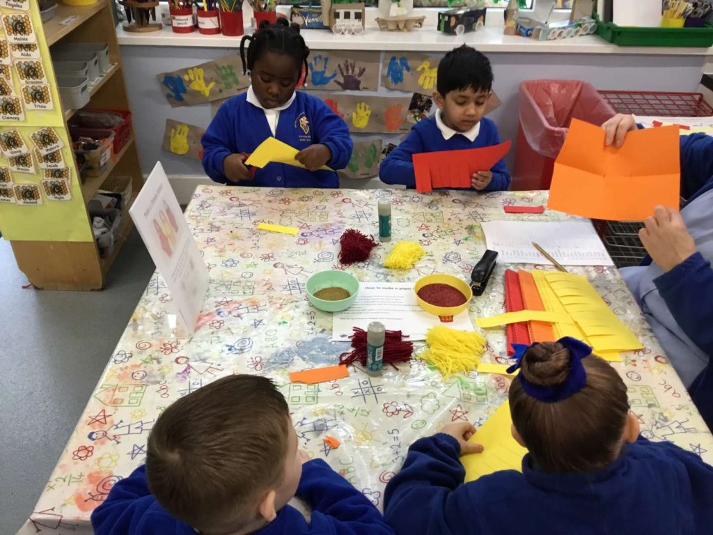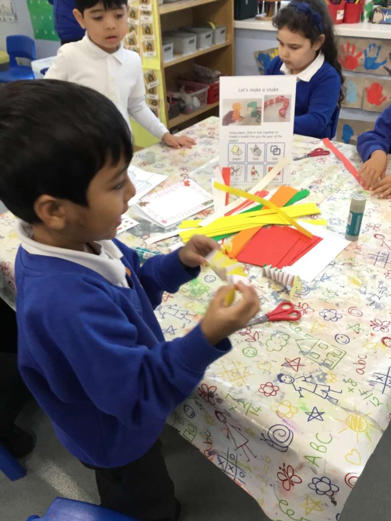Our creative table has been very busy this week! We made colourful Chinese lanterns, “Happy New Year” banners and cards to celebrate. We also created wonderful zigzag Chinese dragons using strips of coloured paper and designed our own dragon faces and heads, thinking carefully about the bright colours and patterns.
