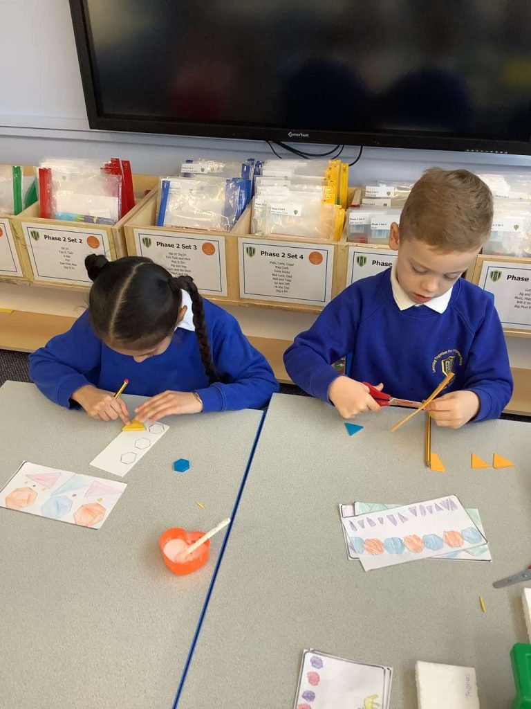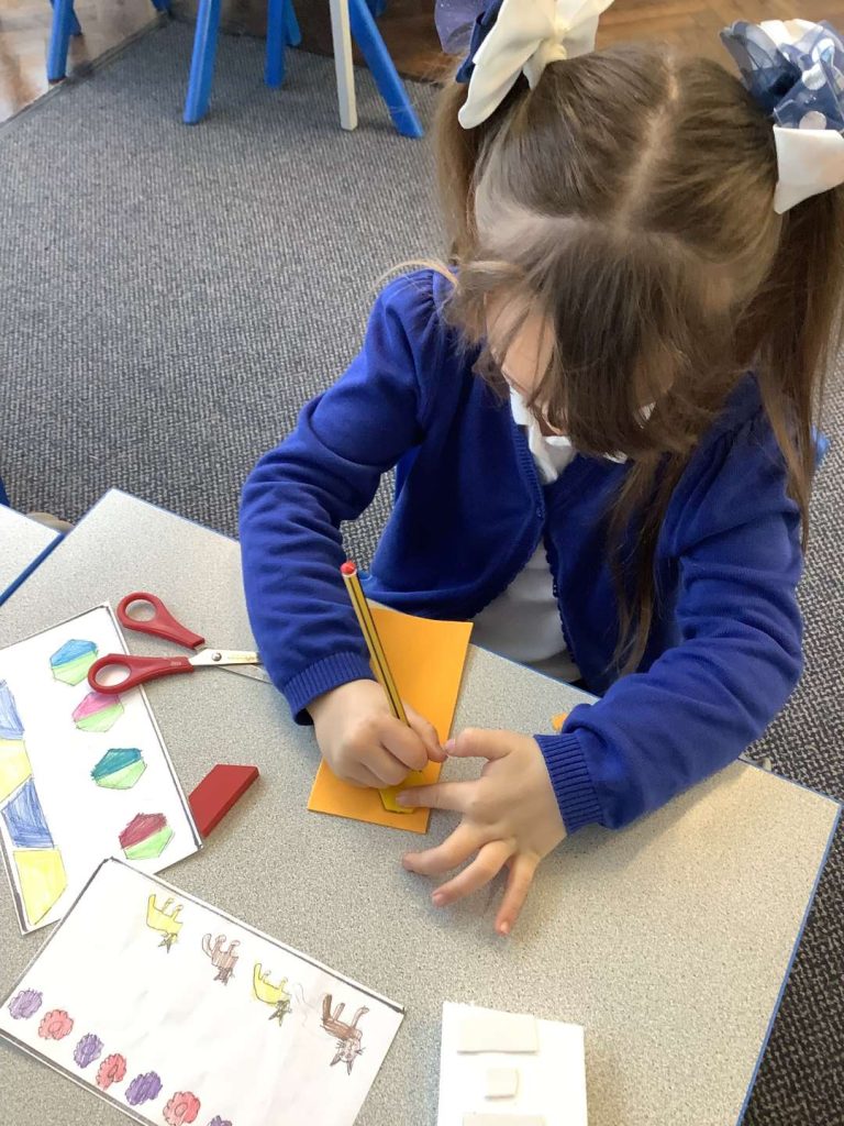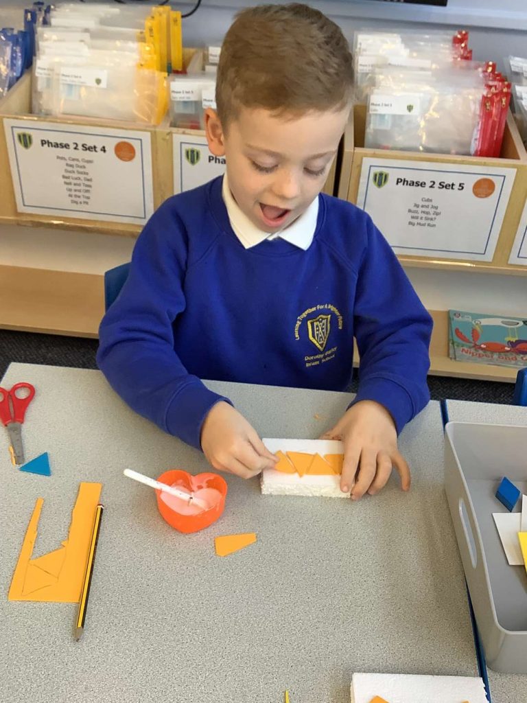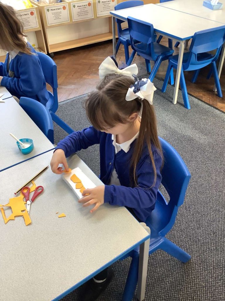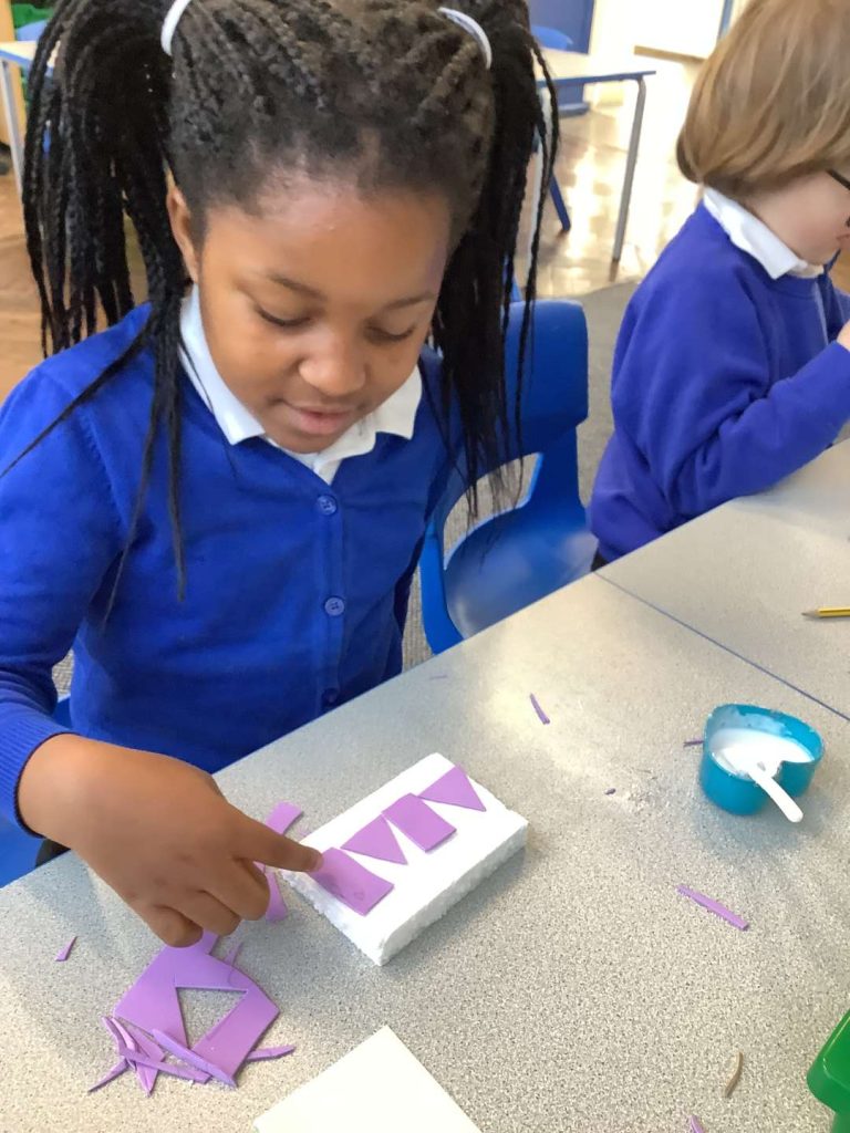 In Art this week, Year 1 have been making printing plates. We cut shapes out of coloured foam and stuck them on to polystyrene to make a printing plate.