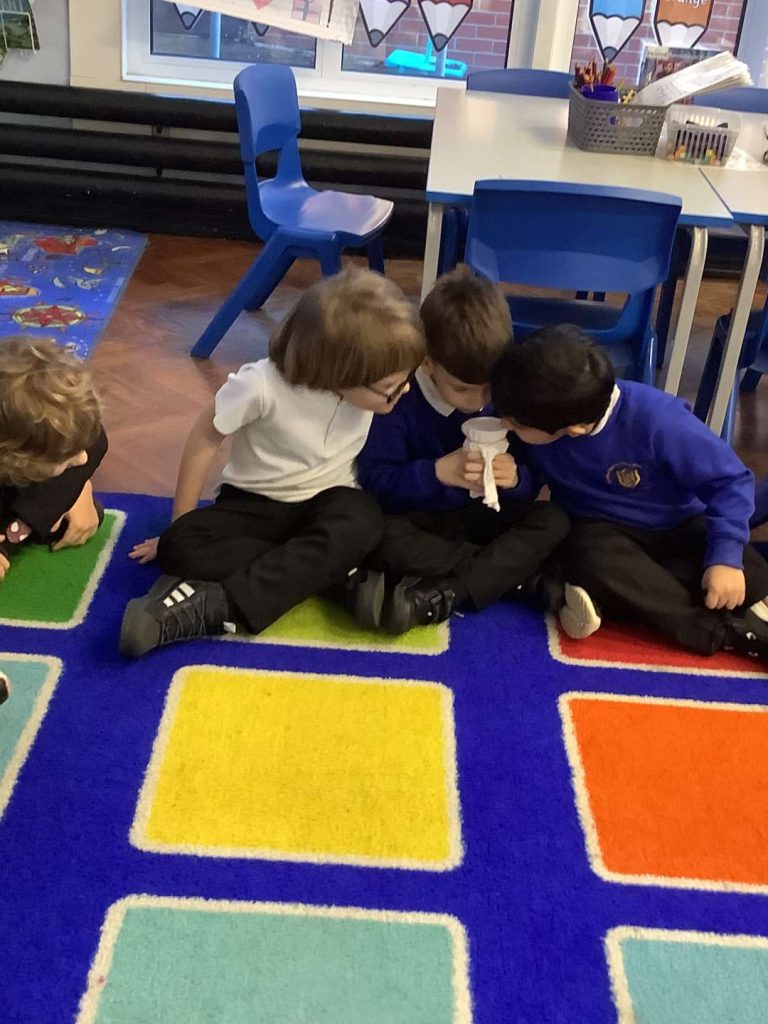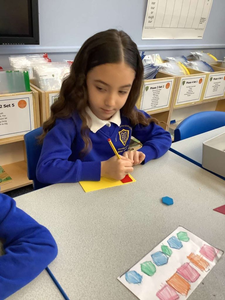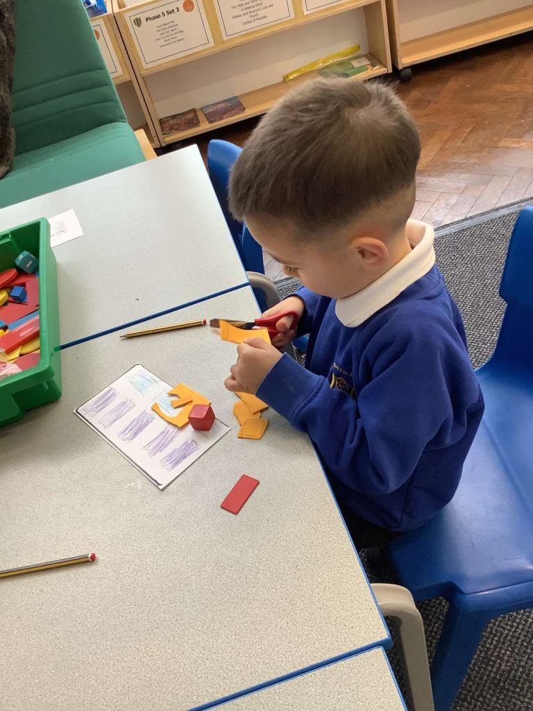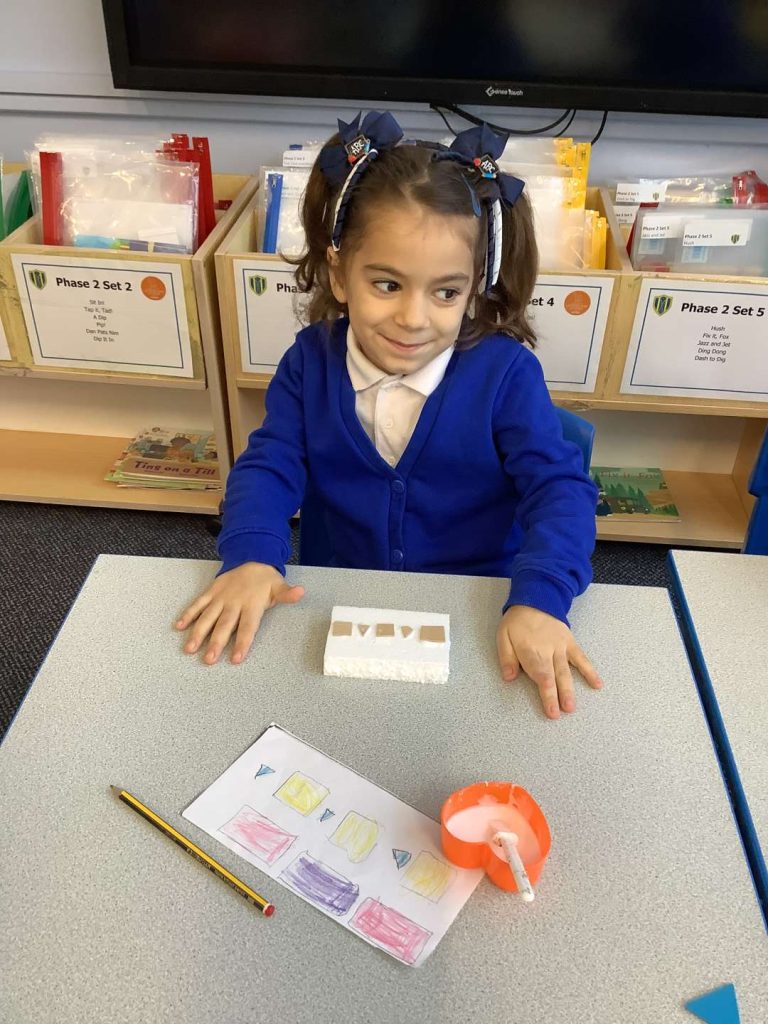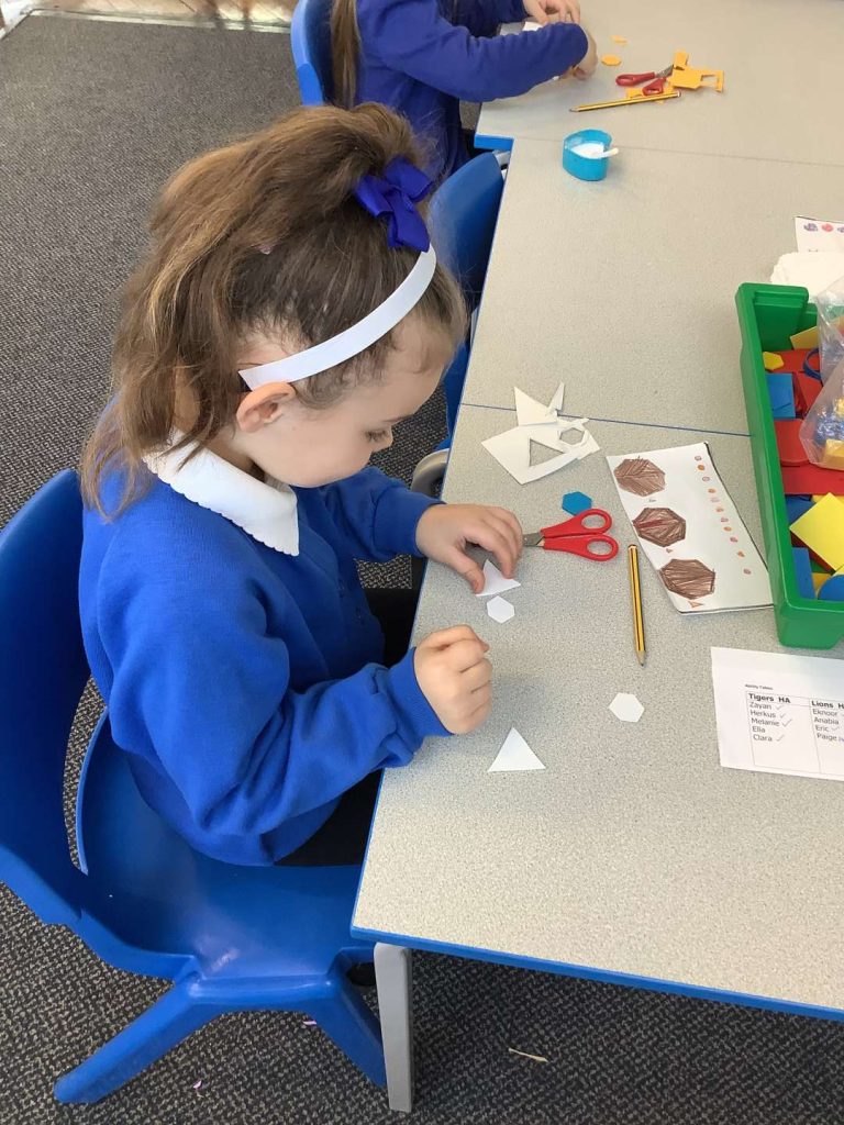 In Art this week, Year 1 have been making printing plates. We cut shapes out of coloured foam and stuck them on to polystyrene to make a printing plate.
